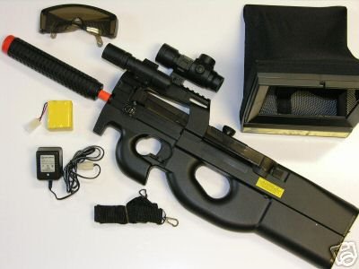This FULLY AUTOMATIC airsoft Belgium P-90 deluxe is one of the newest guns on the market. This one differs from the other P-90 that we have because it has a flashlight, silencer, and a sight at the top.